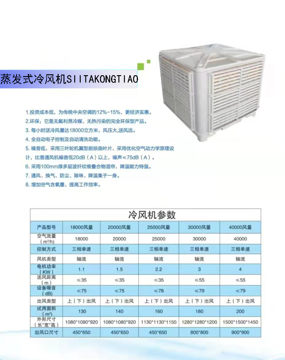 從工廠車間到商業(yè)場所,從倉儲物流到戶外臨時空間,蒸發(fā)式冷風(fēng)機憑借靈活便捷的安裝方式與卓越性能,成為各行業(yè)的降溫優(yōu)選。模塊化設(shè)計支持多臺組合,滿足不同場景需求;智能控制系統(tǒng)可遠(yuǎn)程調(diào)節(jié)風(fēng)速、濕度,操作簡單便捷。選擇蒸發(fā)式冷風(fēng)機,不僅是選擇一份清涼,更是擁抱一種綠色節(jié)能的生活方式。